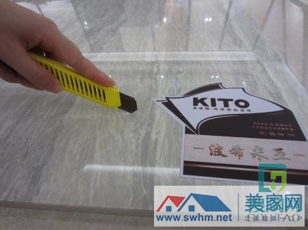 點評:測評員用堅硬的工地專用刀試著刮了一下“波西米亞”釉面,很滑,再來回用力刮,也沒有見到刮痕,用手摸刮處,只是有一些細微的微塵,再擦拭一下,就又是光滑的了,由此可見金意陶的這款“波西米亞”耐磨度非常強。